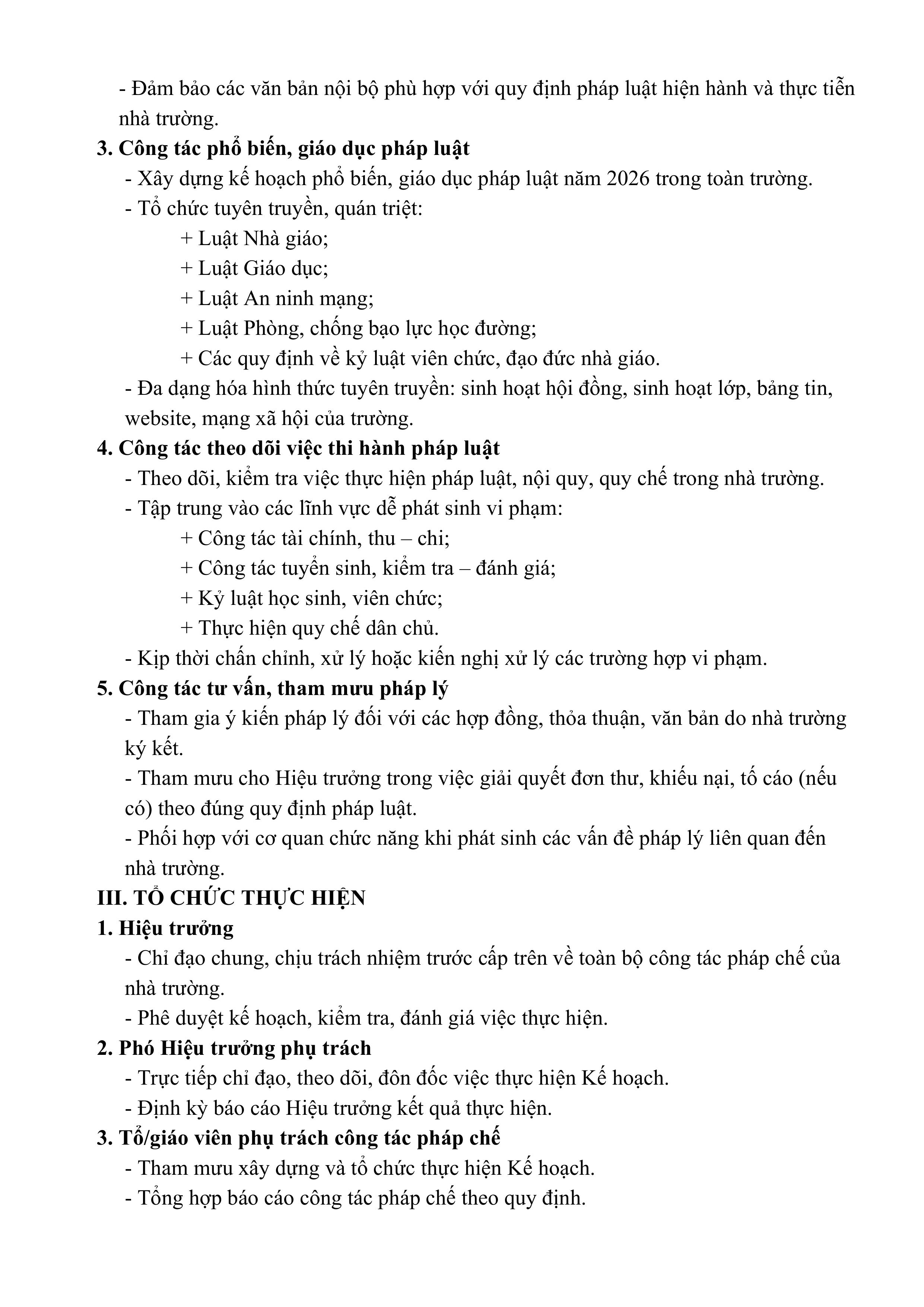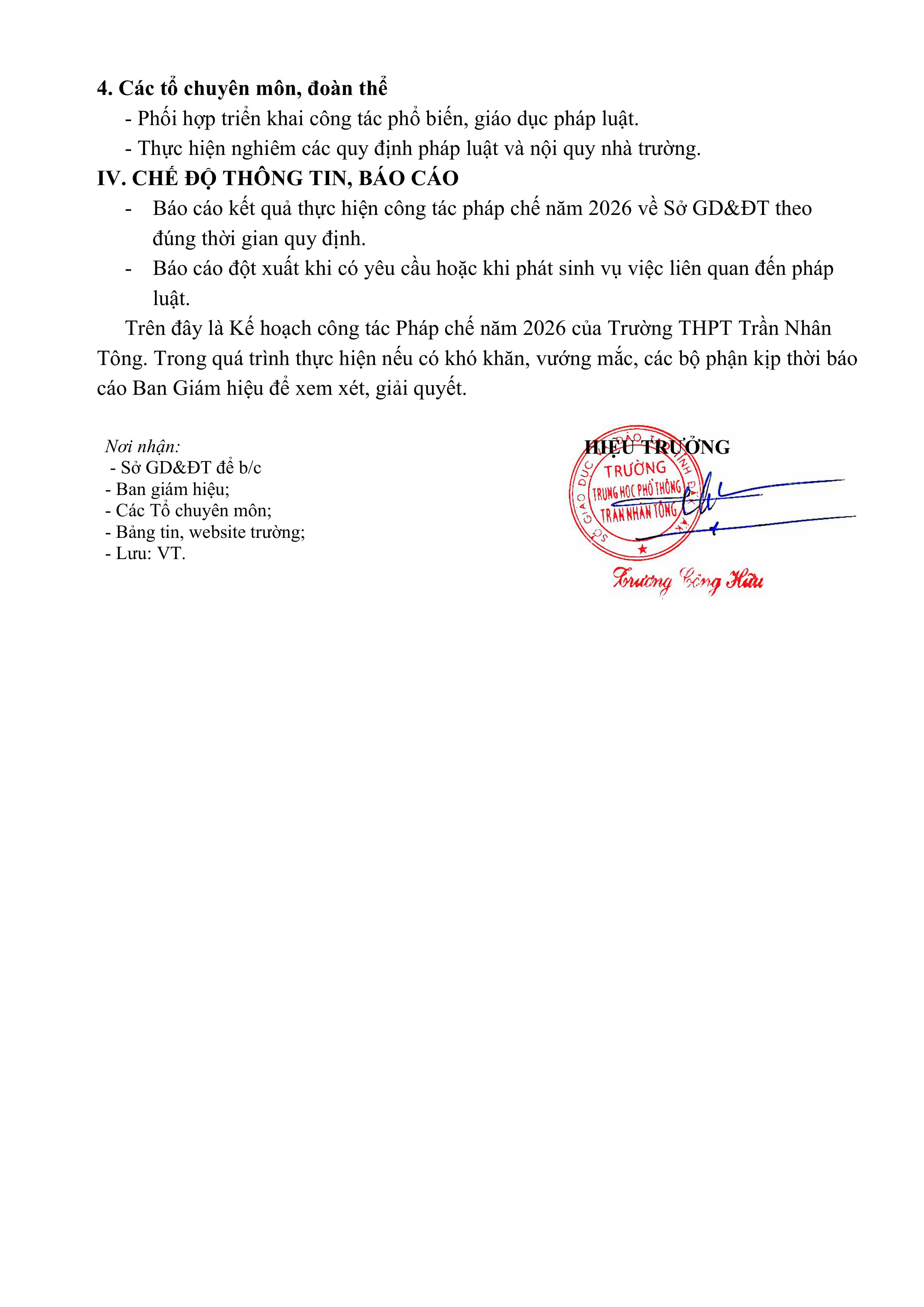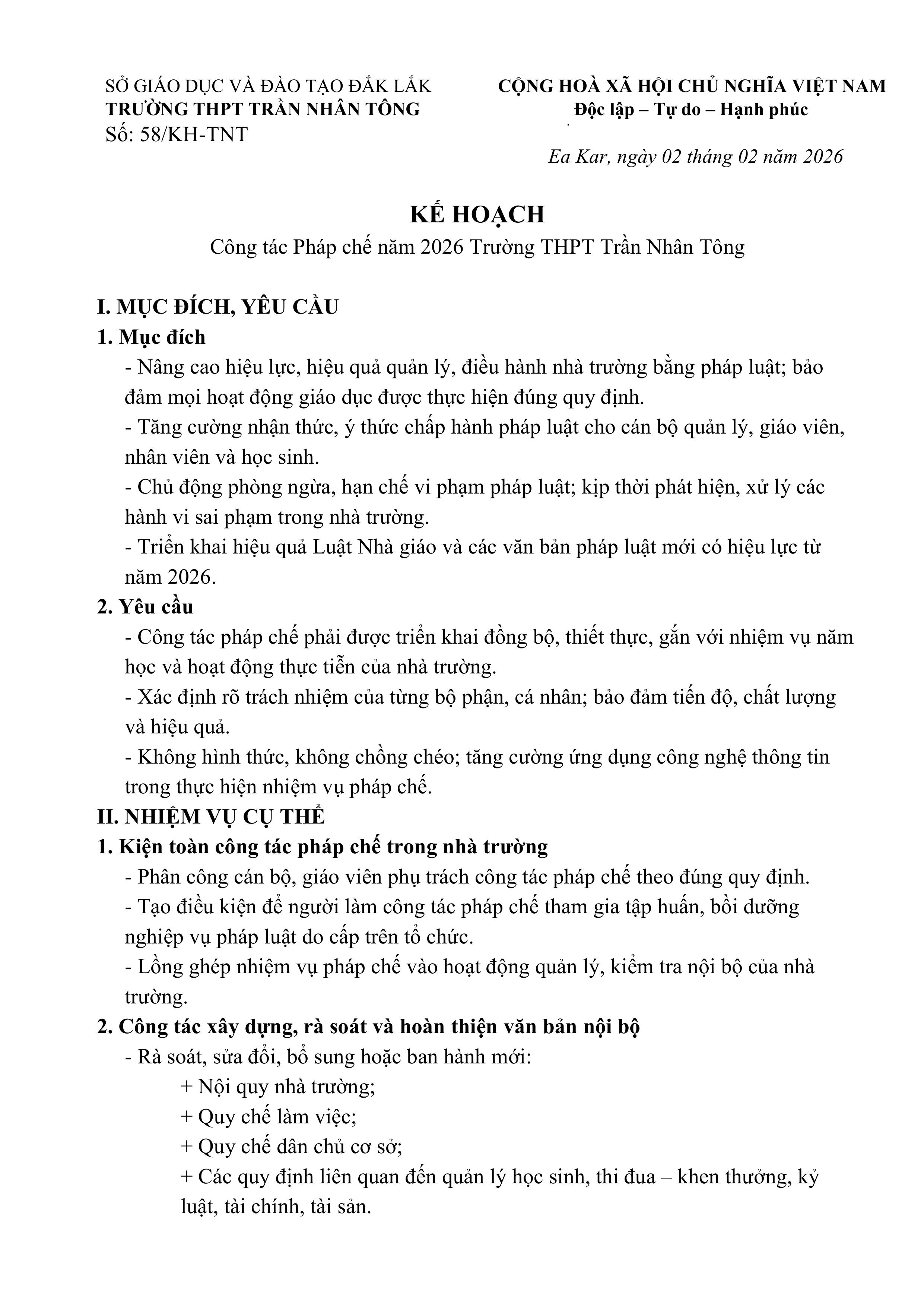 Kế hoạch Công tác Pháp chế năm 2026 Trường THPT Trần Nhân Tông