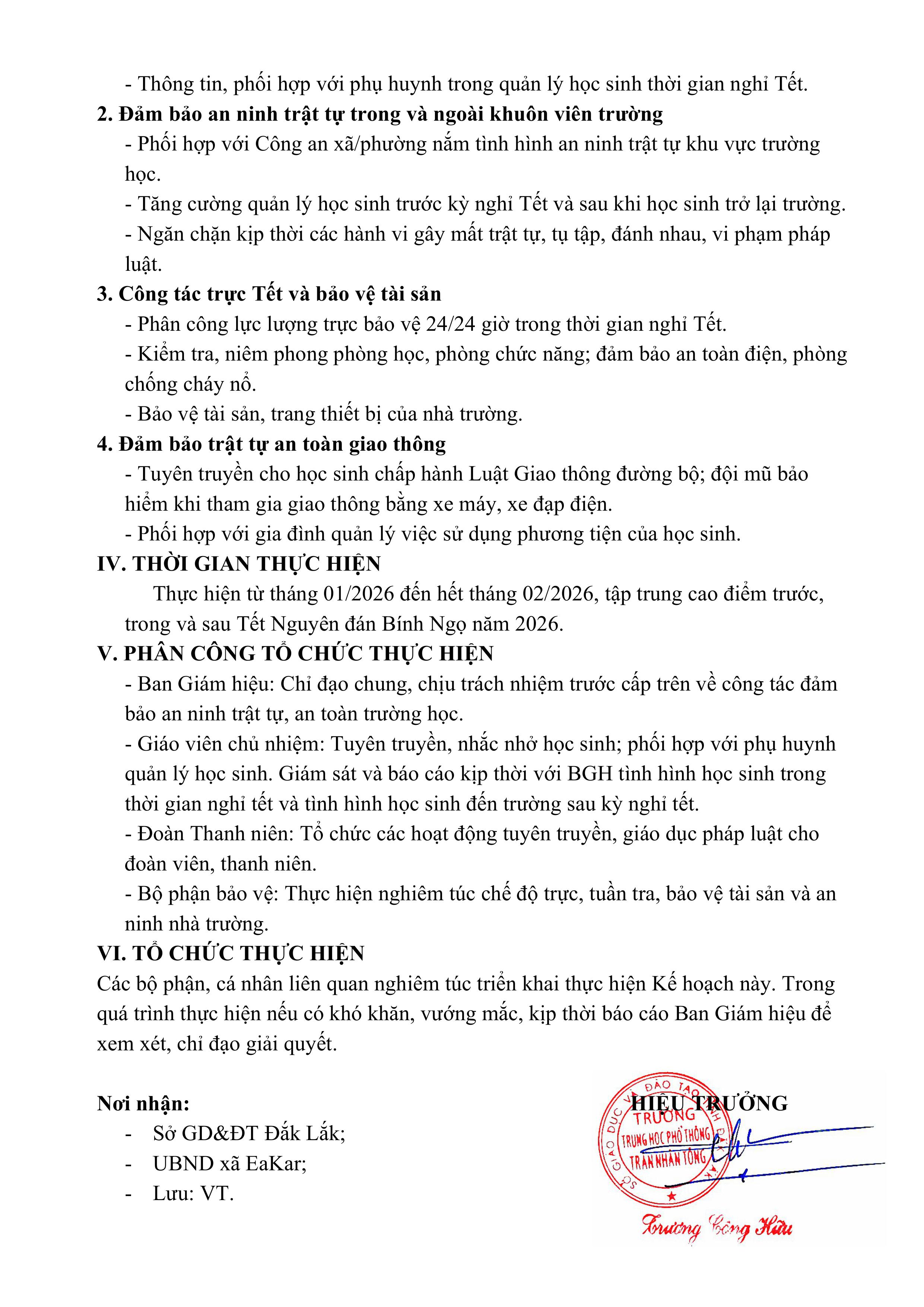 Kế hoạch đảm bảo an ninh trật tự, an toàn trường học thời điểm trước, trong và sau dịp Tết Nguyên đán Bính Ngọ năm 2026