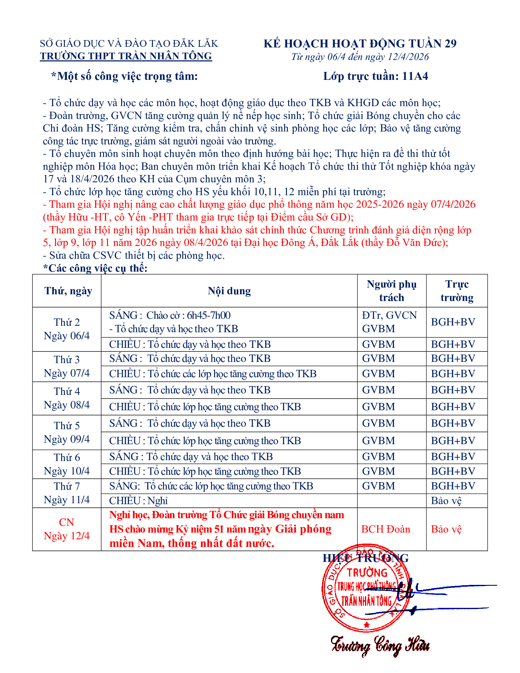 KẾ HOACH HOẠT ĐỘNG TUẦN 29