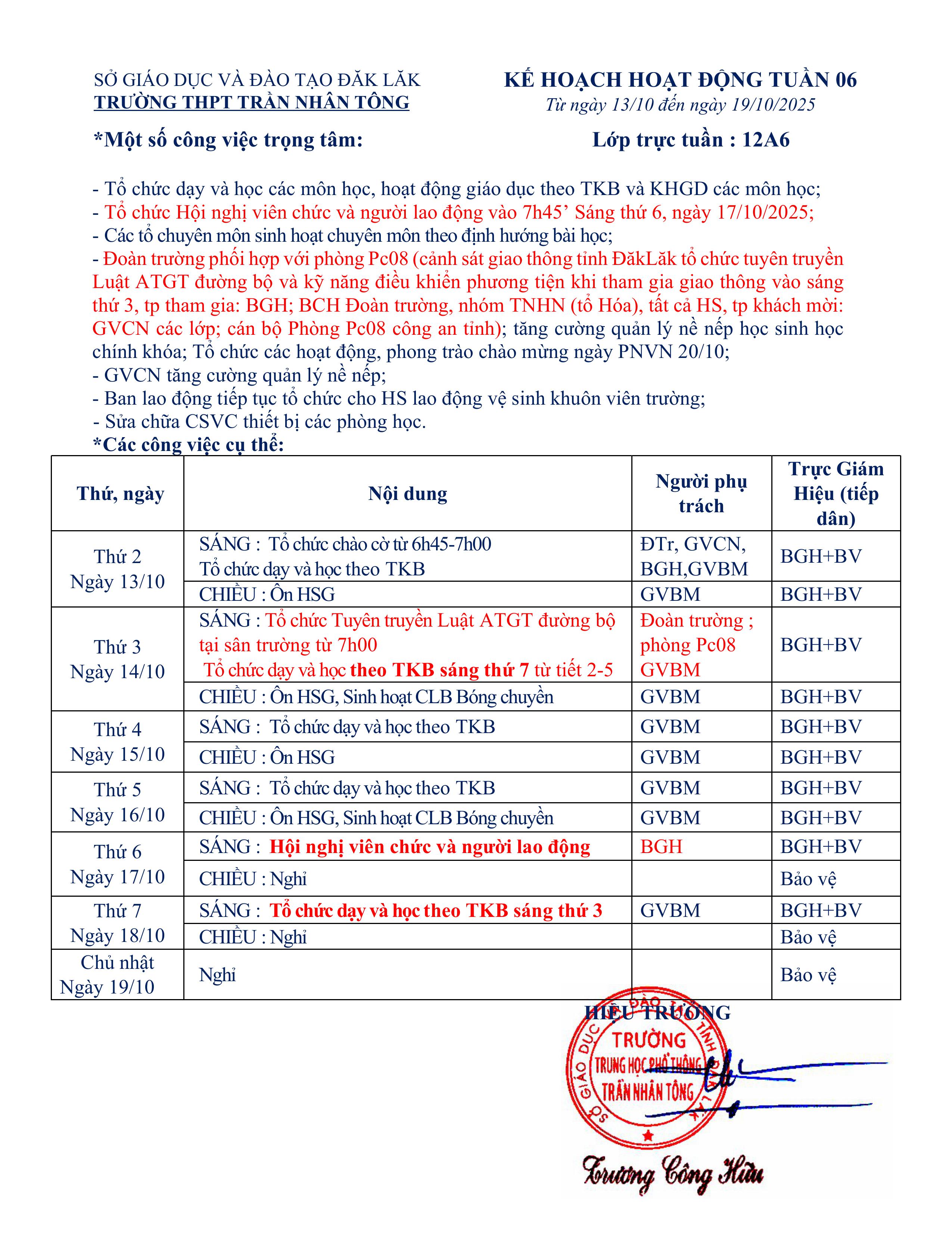 KẾ HOẠCH HOẠT ĐỘNG TUẦN 6