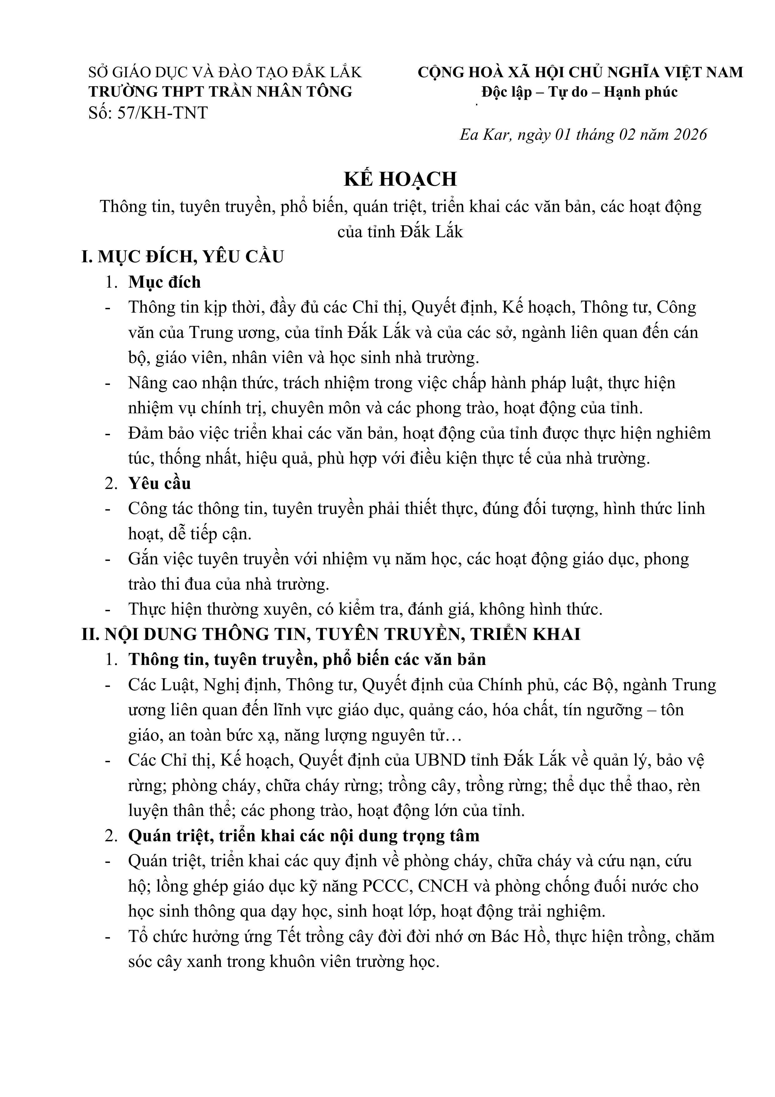 Kế hoạch Công tác Pháp chế năm 2026 Trường THPT Trần Nhân Tông