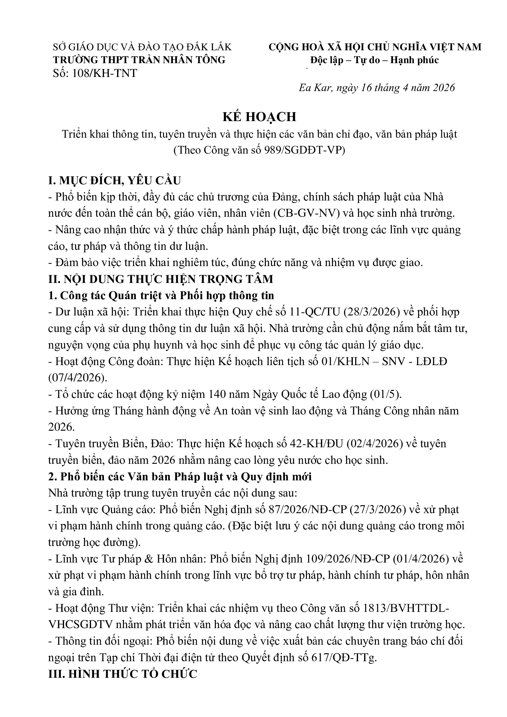 Kế hoạch thông tin, tuyên truyền, phổ biến, quán triệt, triển khai các văn bản chi đạo, văn bản pháp luật và thông tin các hoạt động của tỉnh tháng 4 năm 2026