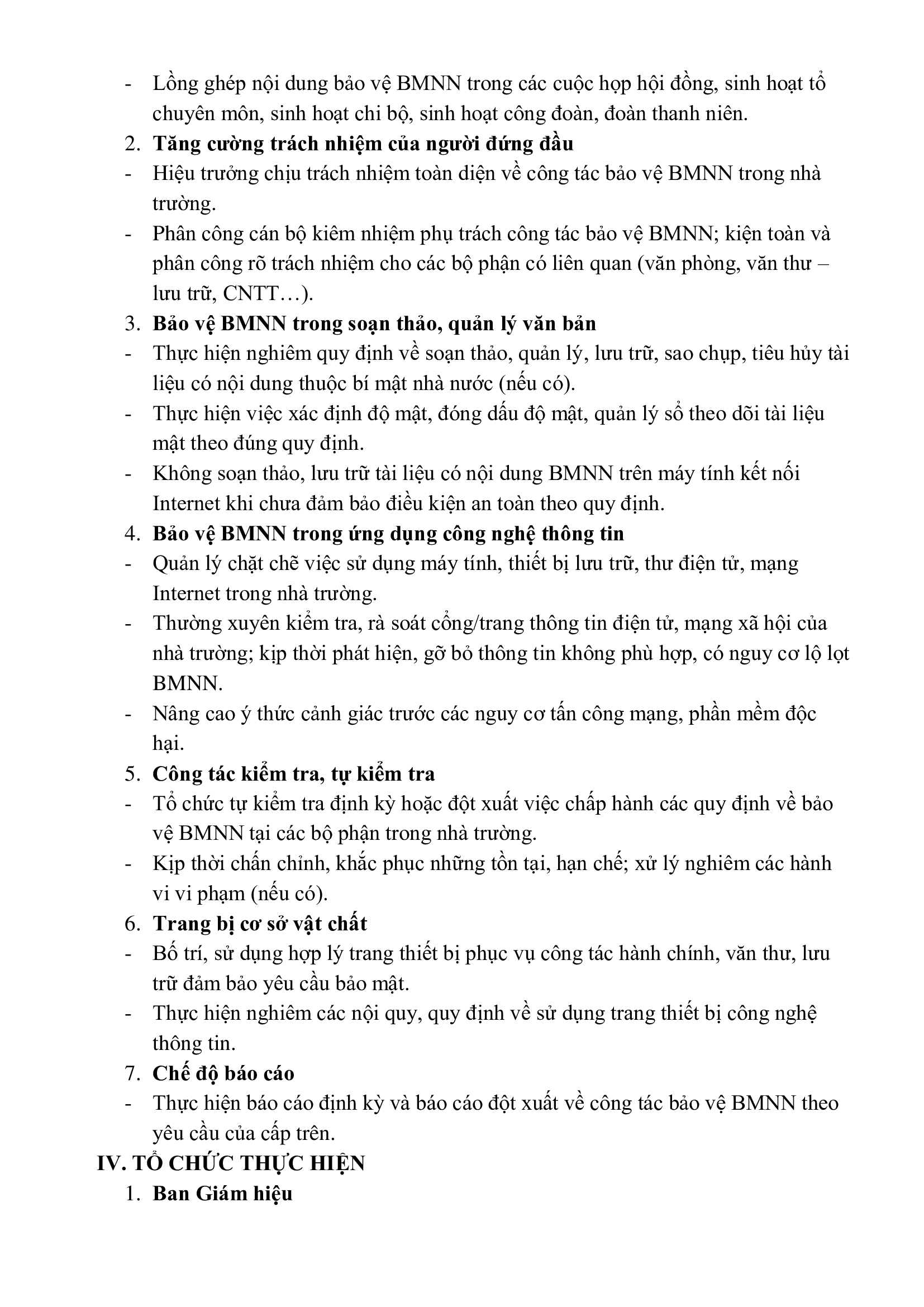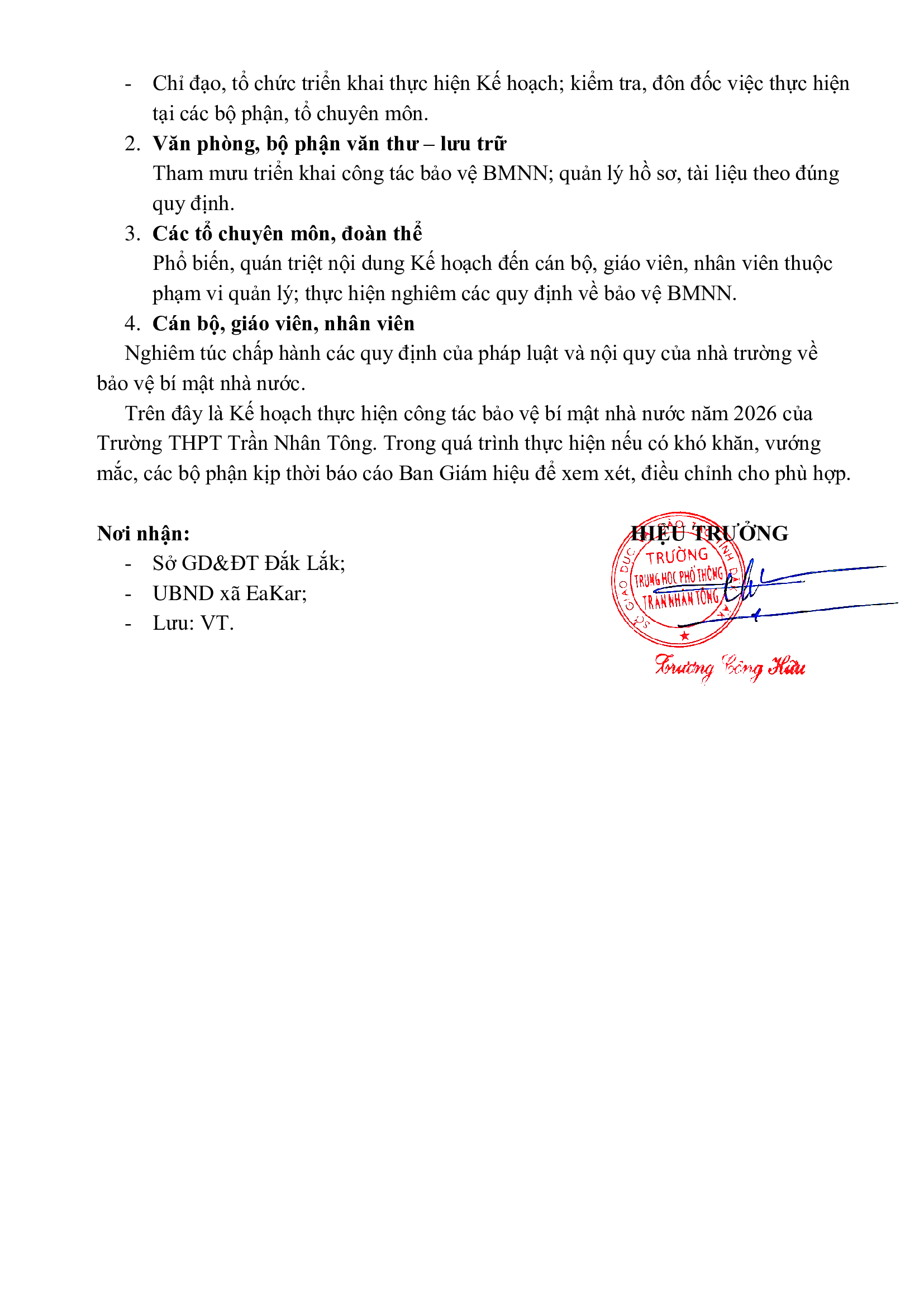 Kế hoạch Thực hiện công tác bảo vệ bí mật nhà nước năm 2026 Trường THPT Trần Nhân Tông