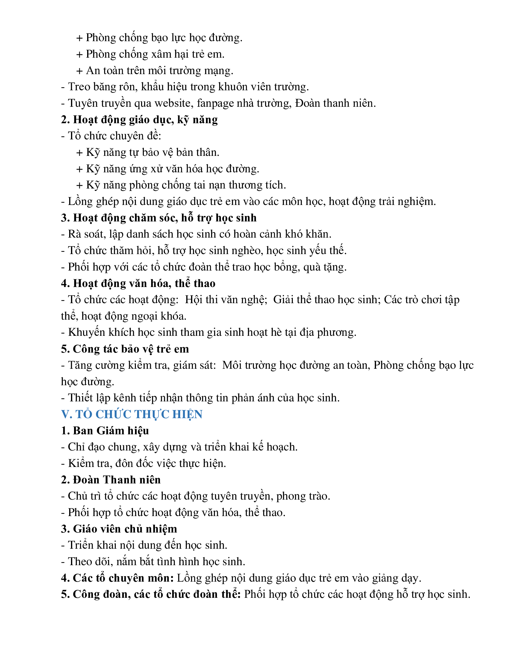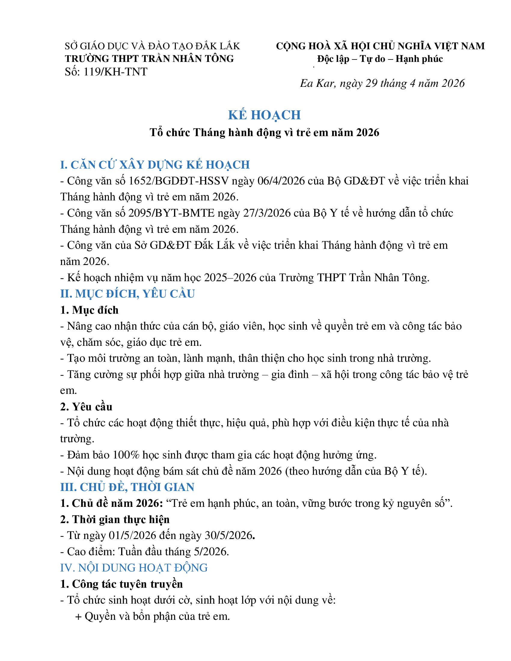 Kế hoạch tổ chức tháng hành động vì trẻ em năm 2026