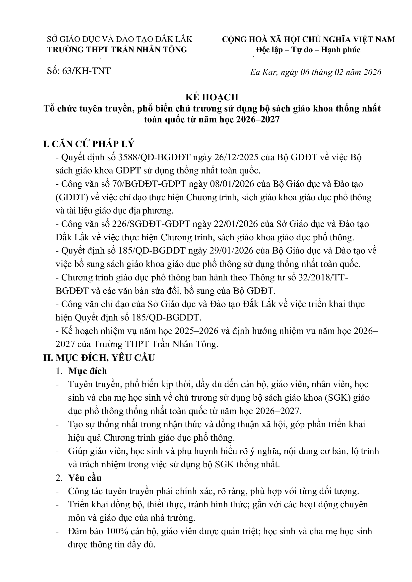 Kế hoạch Tổ chức tuyên truyền, phổ biến chủ trương sử dụng bộ sách giáo khoa thống nhất toàn quốc từ năm học 2026–2027