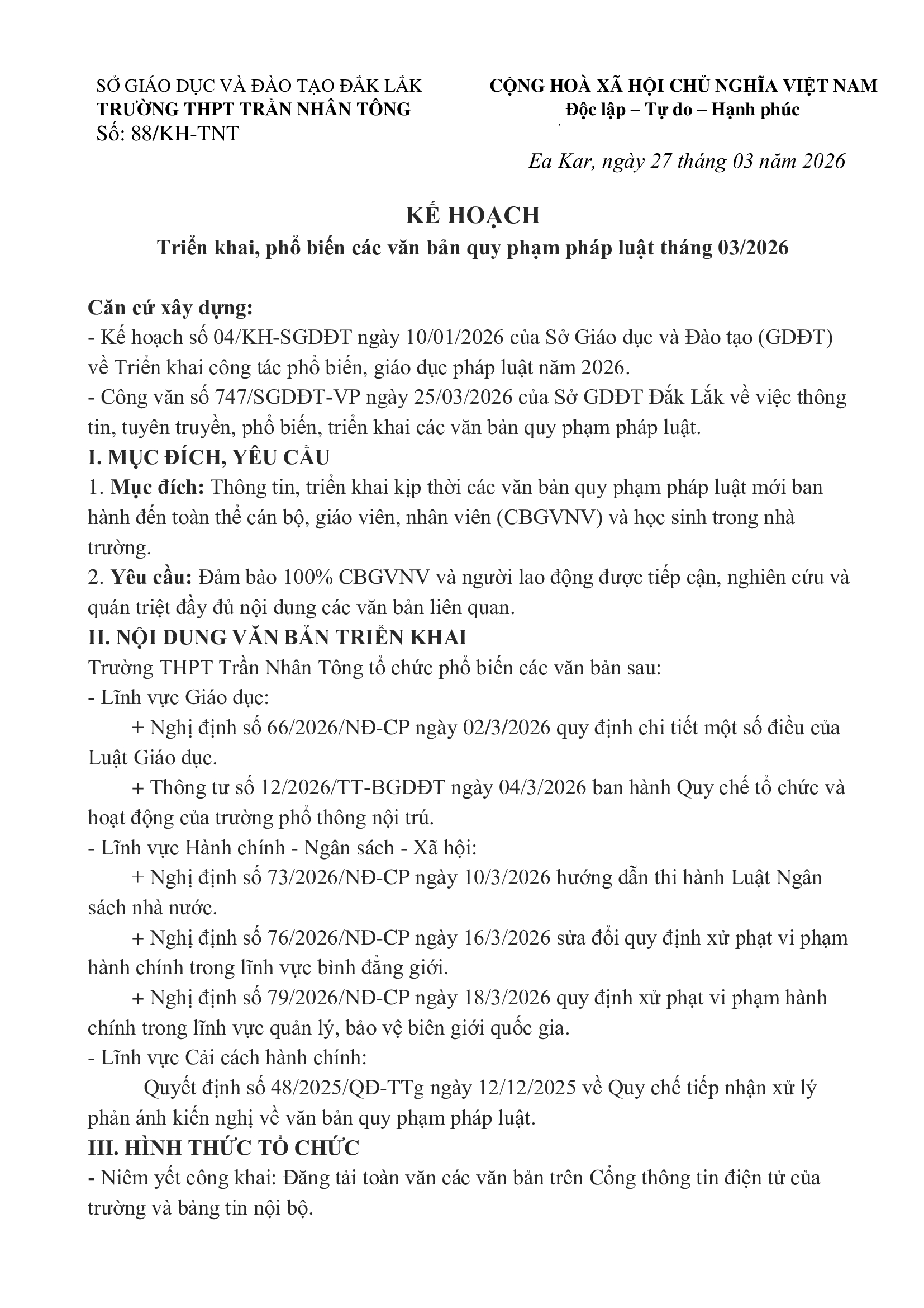 Kế hoạch triển khai, phổ biến các văn bản quy phạm pháp luật tháng 03/2026