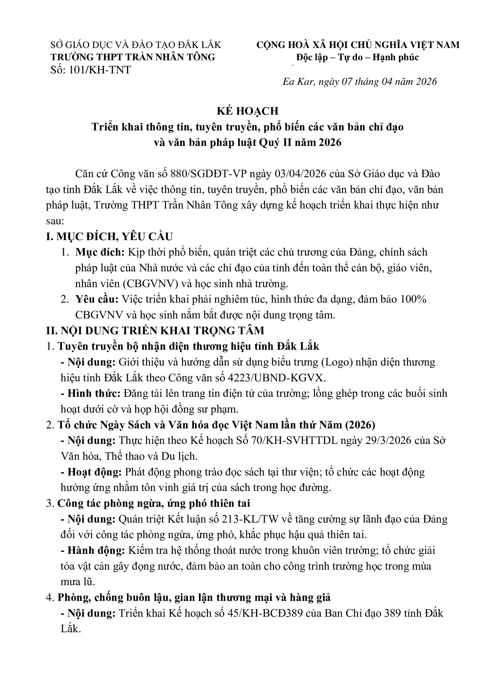Kế hoạch triển khai thông tin, tuyên truyền, phổ biến các văn bản chỉ đạo và văn bản pháp luật Quý II năm 2026