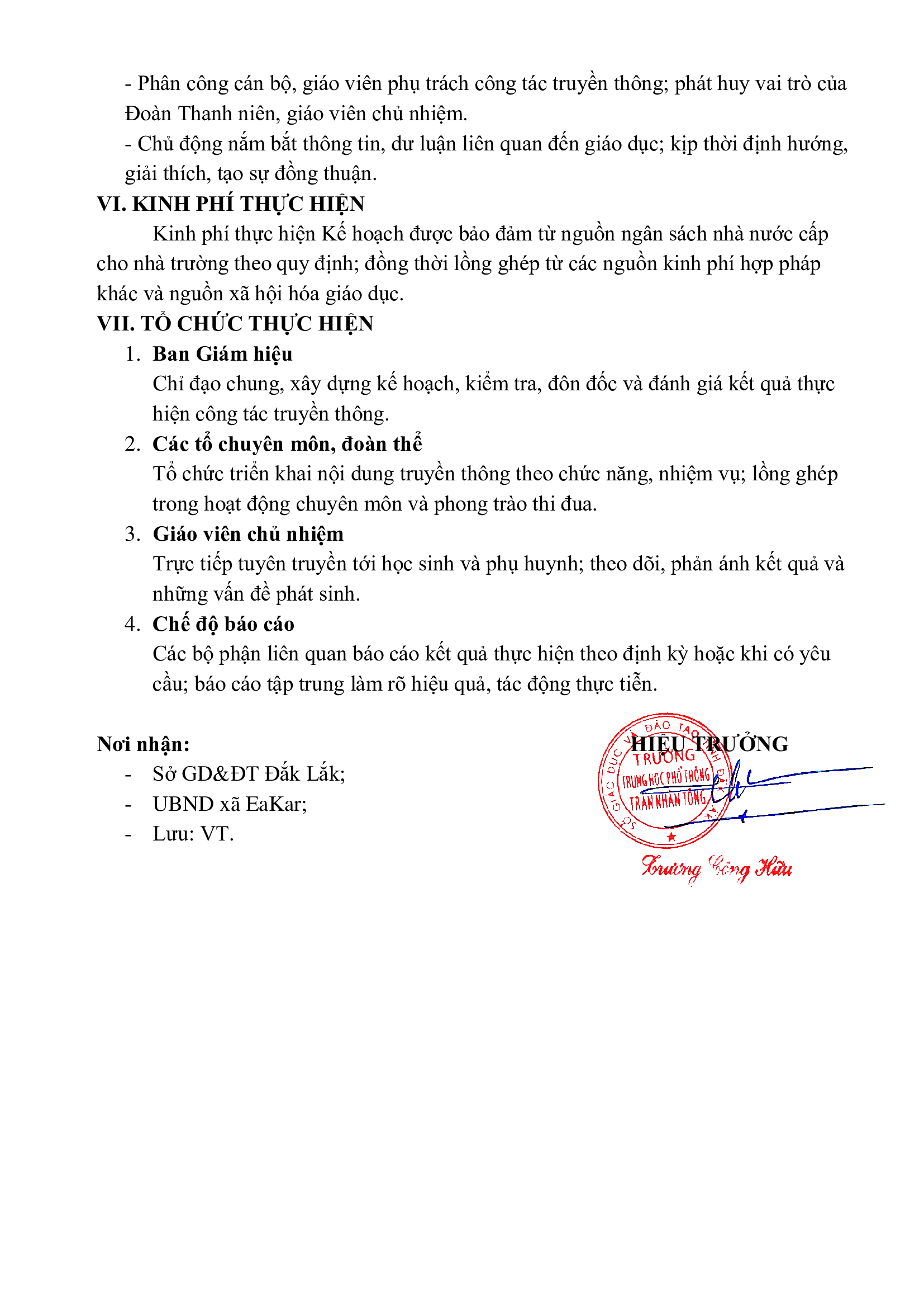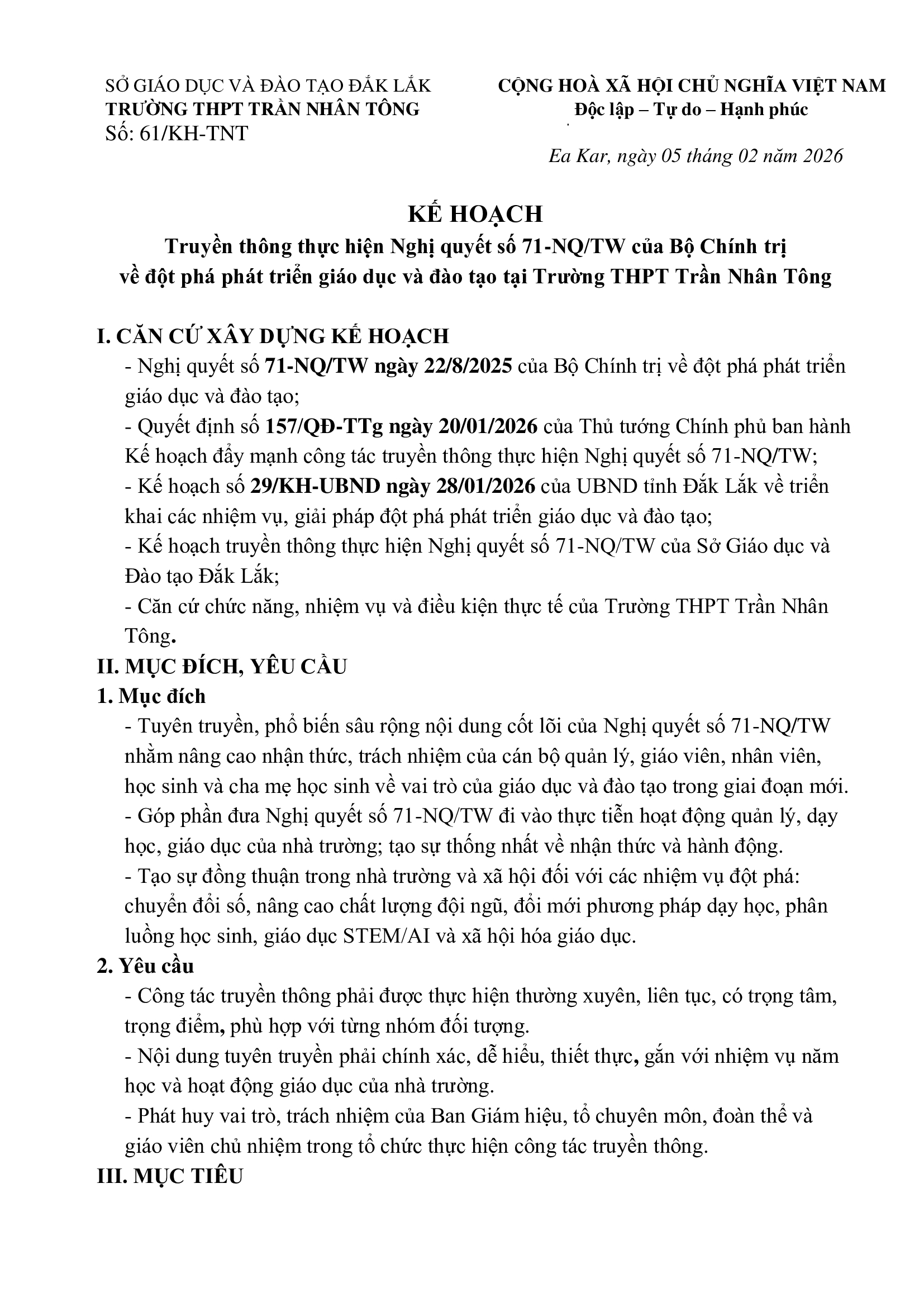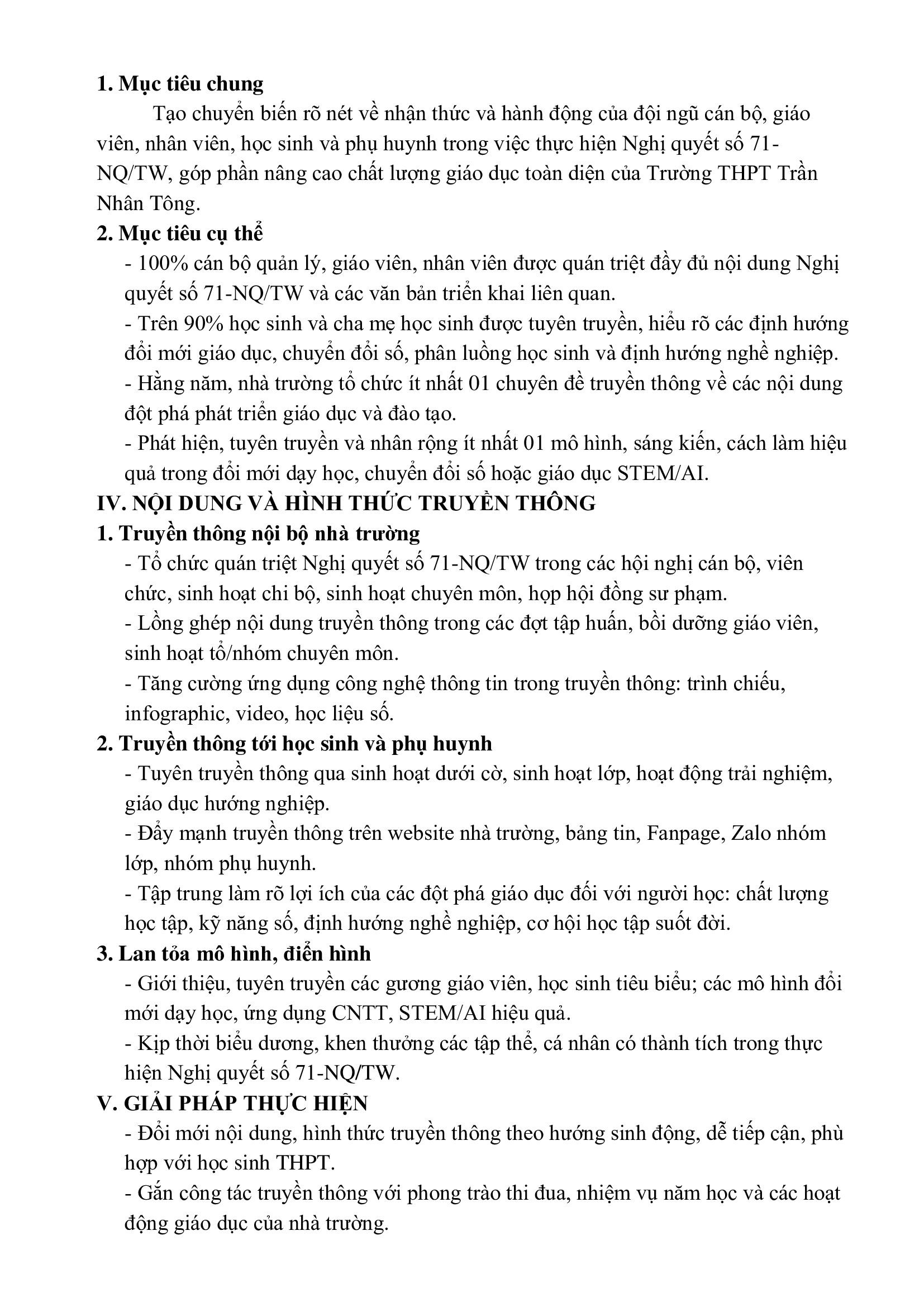 Kế hoạch Truyền thông thực hiện Nghị quyết số 71-NQ/TW của Bộ Chính trị về đột phá phát triển giáo dục và đào tạo tại Trường THPT Trần Nhân Tông